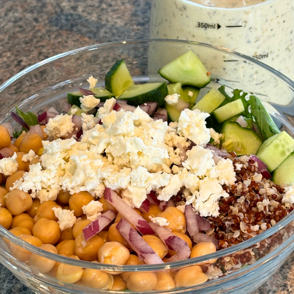 Drizzle it over bowls built with quinoa, farro, buckwheat, brown rice, or couscous. Add roasted vegetables, chickpeas, or grilled chicken, and finish with feta and olives. The creamy tang ties together grains and proteins, making simple ingredients taste complete. Grain bowls are popular because they combine fiber, protein, and healthy fats in one balanced meal—this dressing pulls all of that together.