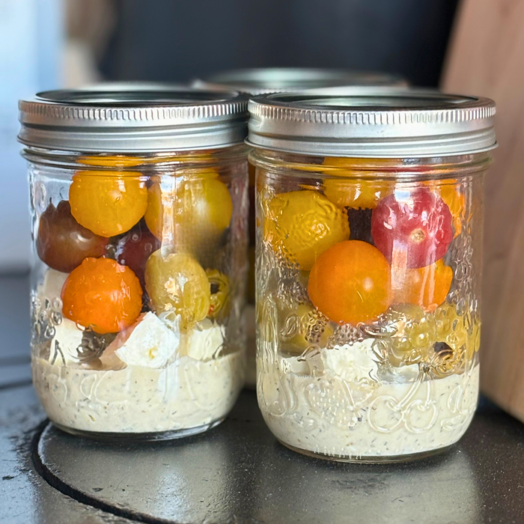 Put some dressing in the bottom of a pint jar. Add cubed feta cheese, cherry tomatoes, and olives. Store in the fridge for ready-to-go snack cups. They’re convenient for lunch boxes or an afternoon pick-me-up.