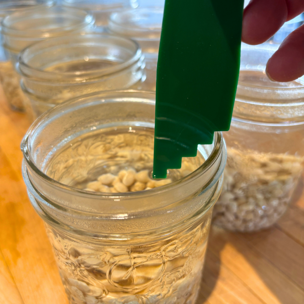 - Use a utensil or bubble remover to release any trapped air. Adjust liquid if needed to maintain headspace.