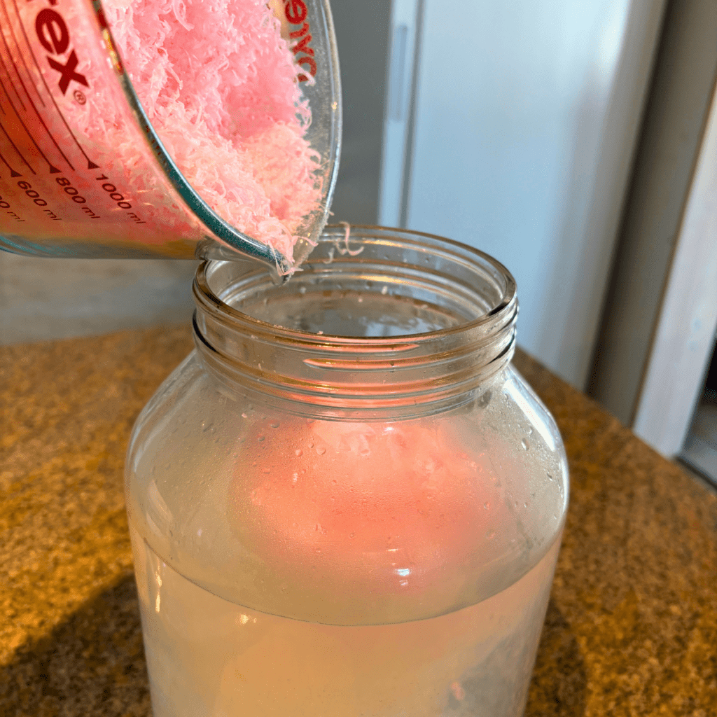 Fill your 1-gallon jar with hot water, leaving about 2 inches below the jar’s neck. Ensure you leave enough room to add the grated bar soap, washing soda, and borax.